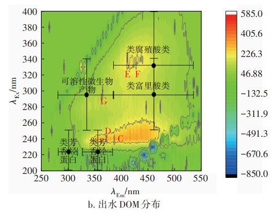進水中僅出現2個熒光峰,其中組分A的峰位置為λEx/λEm=240nm/370nm,為類芳香烴蛋白類物質,而組分B的峰位置為λEx/λEm=280nm/320nm,為高激發(fā)波長色氨酸,屬于類蛋白物質;出水中出現5個熒光峰,其中組分C(λEx/λEm=230nm/370nm)和組分D(λEx/λEm=240nm/380nm)均為類芳香烴蛋白類物質,組分E(λEx/λEm=340nm/420nm)和組分F(λEx/λEm=340nm/425nm)為可見光區(qū)富里酸,而組分G(λEx/λEm=300nm/360nm)則屬于生化過程中產生的色氨酸。可見,過低的進水COD濃度導致系統COD去除率不高,但進出水中的DOM組分卻存在一定差異,且出水DOM類型更加豐富;另外,進水中主要為類芳香烴蛋白類與色氨酸類物質,而出水相比進水增加了類富里酸類物質,可能是因為進水中的DOM參與了生化反應,導致了組分的變化。