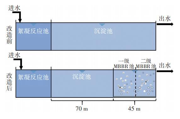 改造前后水廠的主要工藝流程見圖1。設計進水COD、BOD5、TP、SS分別為40、15、1.5、60mg/L,設計出水濃度分別為30、7、1、50mg/L。對氨氮的處理要求與進水水質相關,當進水氨氮≥6mg/L時,系統對氨氮的去除量需大于5mg/L;當進水氨氮為3~6mg/L時,系統對氨氮的去除率不得低于84%;當進水氨氮<3mg/L時,要求出水氨氮<0.5mg/L。