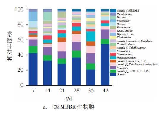 Nitrosomonas在一、二級生物膜中的相對豐度分別為2.89%~5.64%、0.00%~3.48%,該菌屬為常見的短程硝化細菌,其在不同時間的相對豐度無明顯變化規(guī)律,但受一、二級進水氨氮濃度影響,除第35天外,其在一級生物膜中的相對豐度均高于二級生物膜。Kouleothrix在一、二級生物膜中的相對豐度分別為1.00%~5.56%、1.88%~4.38%,該菌屬為絲狀菌,在活性污泥系統中與污泥膨脹有關,在生物膜中則可能參與生物膜骨架的形成過程,該菌屬在不同時間不同樣品中的相對豐度均無明顯變化規(guī)律。Pedomicrobium在一、二級生物膜中的相對豐度分別為1.45%~2.88%、1.71%~6.45%,該菌屬可進行反硝化脫氮,同時部分菌種對高鹽度具有一定的耐受性。Pedobacter僅在第7天大量存在于一、二級生物膜中,相對豐度分別為12.38%、11.37%,其余時間相對豐度均小于0.05%,該菌屬為污水處理系統內常見的脫碳菌,部分菌種可降解酚類物質,其在啟動前期相對豐度較高可能與進水水質差異有關。