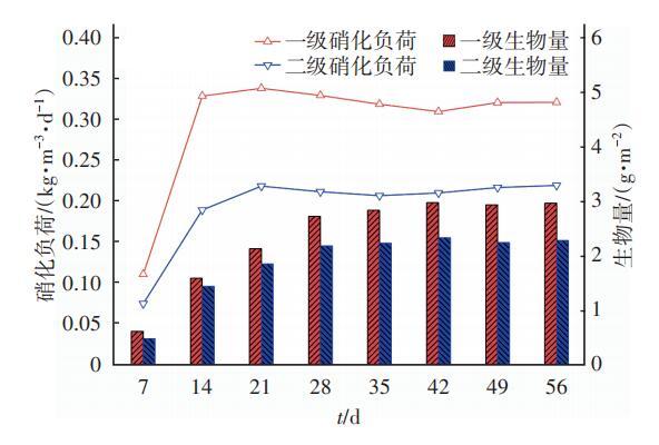 為了更準確地表征懸浮載體的硝化能力,投加懸浮載體后每7d取一、二級懸浮載體進行硝化小試,并核算硝化負荷,同步測定生物膜的生物量與厚度。硝化小試及生物量測定結果如圖6所示。懸浮載體掛膜7d后,一、二級的硝化負荷分別為0.111、0.075kg/(m3·d);在后續(xù)的7d迅速升高至0.328、0.189kg/(m3·d),此后分別穩(wěn)定在(0.32±0.008)、(0.21±0.010)kg/(m3·d),一級硝化負荷是二級硝化負荷的1.5倍左右,且均高于項目實際運行中核算的硝化負荷。由于小試的進水氨氮濃度較實際工程中的要高,因此懸浮載體表現出更高的硝化負荷,這與硝化負荷受進水基質濃度影響的結果相符。同時,也說明懸浮載體生物膜存在負荷余量,這為MBBR良好的抗水質沖擊性能奠定了生物學基礎。