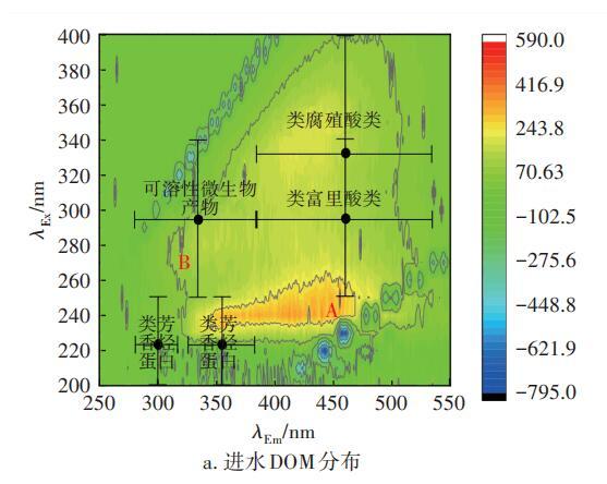 本項目的實際進水COD濃度較低,并非重點控制指標,但為研究MBBR系統對低濃度COD的降解效果,測定了沿程COD濃度變化。結果顯示,自出水氨氮達標后,MBBR區(qū)進水、一級出水、二級出水COD濃度分別為(7.36±1.20)、(7.04±1.21)、(6.87±1.17)mg/L,COD去除率為(6.80±1.68)%。DOM熒光數據的分峰結果如圖4所示。
