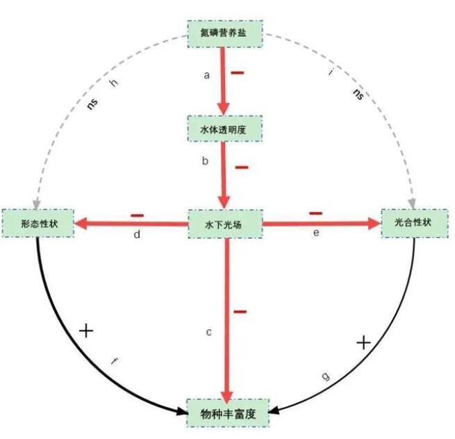 在富營(yíng)養(yǎng)化湖泊中,氮磷濃度的升高往往會(huì)直接導(dǎo)致水體透明度的降低,進(jìn)而影響水下光場(chǎng)的分布,而不同沉水植物會(huì)通過(guò)功能性狀的權(quán)衡來(lái)適應(yīng)水下弱光環(huán)境,如穗狀狐尾藻、竹葉眼子菜、篦齒眼子菜等冠層型沉水植物會(huì)通過(guò)莖伸長(zhǎng)快速生長(zhǎng)到水面來(lái)獲取足夠的光照,而苦草則主要通過(guò)提高光合作用的效率來(lái)適應(yīng)弱光環(huán)境。功能性狀之間的權(quán)衡在一定程度上決定了沉水植物的物種豐富度(圖4)。