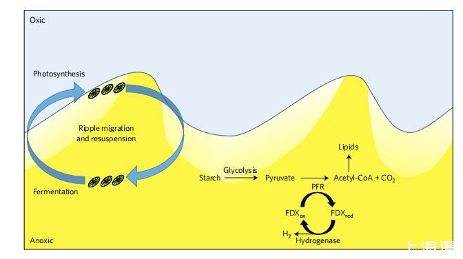 圖3|沙沉積物中底棲藻類代謝的概念模型。在這種充滿活力的環(huán)境中,漣漪遷移和沉積物再懸浮有規(guī)律地將藻類細(xì)胞移動到許多厘米深的沉積物中,那里是黑暗和缺氧的。在這些條件下,微藻會進(jìn)行黑暗發(fā)酵,產(chǎn)生大量H2和脂質(zhì)25。酶名稱為丙酮酸鐵氧還蛋白氧化還原酶(PFR)和鐵氧還蛋白(FDX)。輕度陰影區(qū)域表示沉積物中的氧濃度下降。黃色陰影區(qū)域表示缺氧滲透性沉積物。