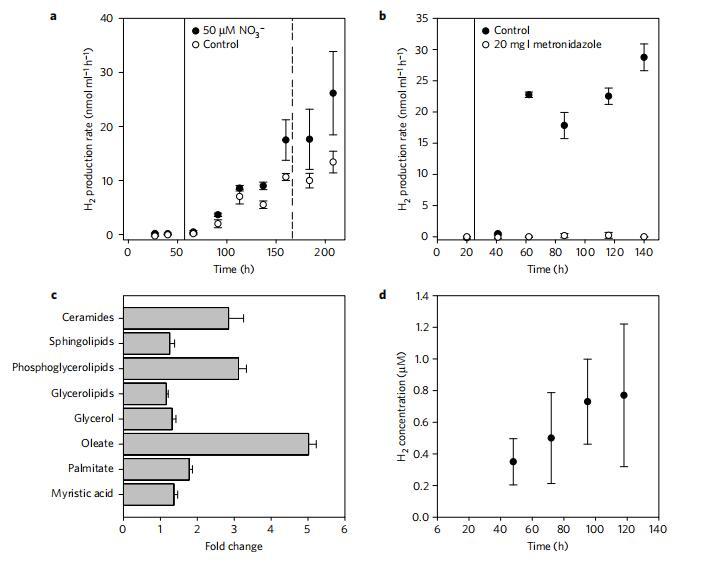 在證明海洋系統(tǒng)中主要的呼吸電子受體不能解釋DIC的產(chǎn)生后,我們尋找了其他可能導(dǎo)致碳礦化的潛在來源。有趣的是,我們通過微傳感器實驗觀察到,氫氣開始產(chǎn)生~缺氧開始后36小時。FTR中的H2濃度達(dá)到44±10μmol l?1和23±4μmol l?1(數(shù)據(jù)未顯示)分別在存在和不存在硝酸鹽的情況下(圖2a)。這些濃度幾乎比之前報道的2至6μM細(xì)菌發(fā)酵產(chǎn)生的最大瞬時H2濃度高一個數(shù)量級(參考文獻(xiàn)19,20)。這些值對應(yīng)于26±7 nmol-ml的生產(chǎn)率?1小時?1和13±2 nmol ml?1小時?1,而此時這些色譜柱中DIC的生成率分別為120±46和80±36 nmol-ml?1小時?1分別在含和不含硝酸鹽的缺氧處理中(數(shù)據(jù)未顯示)。添加濃度為150μmol l的抗生素環(huán)丙沙星?1至色譜柱對產(chǎn)氫沒有影響(圖2a)。單種分析表明,環(huán)丙沙星的EC-50值在15至51 nmol之間?1對于典型的革蘭氏陽性菌21、22和241 nmol?1為革蘭氏陰性菌putida23。已經(jīng)證明,真核生物對環(huán)丙沙星的敏感度要低得多,因為綠藻物種羊角硒藻(Selenastrum capricornutum)和亞首烏偽麒麟菜(Pseudokirchnerilla subcapitata)的EC-50值在9000 nmol/l之間?1和56000 nmol?1(參考文獻(xiàn)24)。盡管存在環(huán)丙沙星,但在對照和硝酸鹽處理中,H2的生成都持續(xù)存在,并且在整個實驗過程中確實持續(xù)增加。這有力地表明,與DIC生產(chǎn)一樣,H2生產(chǎn)不能歸因于細(xì)菌來源,因此可能是由真核生物產(chǎn)生的,已知真核生物能夠在缺氧條件下通過發(fā)酵產(chǎn)生H2 25。