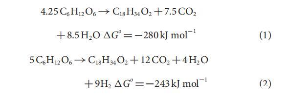 反應(yīng)1和2表明葡萄糖分解生成油酸和其他發(fā)酵產(chǎn)物的可能化學(xué)計量比,并且在標(biāo)準(zhǔn)條件下是自發(fā)的。在非標(biāo)準(zhǔn)條件下,無論H2和CO2分壓高(0.8 atm),這兩個反應(yīng)都保持自發(fā);然而,在pCO2和pH2<0.3 atm時,反應(yīng)2變得最有利(參見補(bǔ)充圖2)。