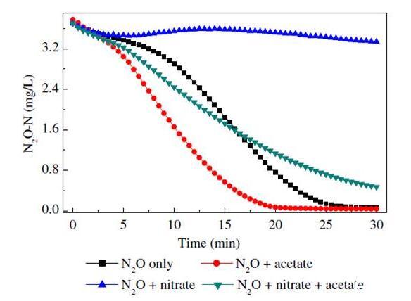 圖4、不同條件下的N2O還原特征,只存在氧化亞氮,同時(shí)存在氧化亞氮和乙酸鈉,同時(shí)存在氧化亞和硝酸鹽,同時(shí)存在氧化亞氮、硝酸鹽和乙酸鈉。從圖中可以看出當(dāng)存在外碳源乙酸時(shí),氧化亞氮的還原速率明顯加快。這要是因?yàn)橐宜岬慕到馑俾时萈HA碳源快倍6-20倍,氧氧化亞氮還原酶在單位時(shí)內(nèi)能夠獲得充足的電子進(jìn)行N2O的還原。存在硝酸鹽的時(shí)候,N2O的還原受附,甚至還冇上升的趨勢(shì)。硝酸鹽還原對(duì)電子的競(jìng)爭(zhēng)優(yōu)勢(shì)要大于氧化亞氮還原酶,PHA氧化產(chǎn)生的子要首先硝酸鹽的還原。外碳源乙酸和乙酸鉀共同投加時(shí),N2O的還原并沒(méi)有受到限制,這主要是因?yàn)橐宜嶂形粫r(shí)間內(nèi)捉供的電子能夠同吋滿(mǎn)足NO3-和N2O的還原。