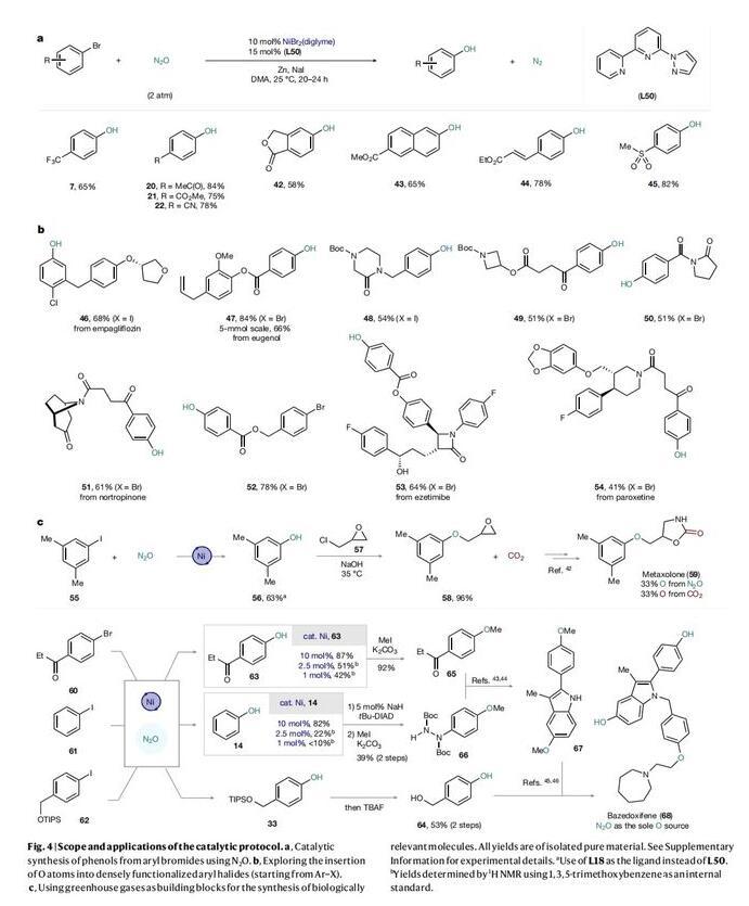 Josep Cornella教授課題組將N2O作為綠色氧源,利用有機(jī)金屬Ni配合物活化N2O,在溫和條件下成功地將一系列芳基鹵化物高選擇性地轉(zhuǎn)化為高價值的酚類化合物。這種獨(dú)特的有機(jī)金屬C-O鍵形成不同于當(dāng)前基于還原消除的策略,并為芳基鹵化物轉(zhuǎn)化為酚類化合物提供了新方法和新借鑒。