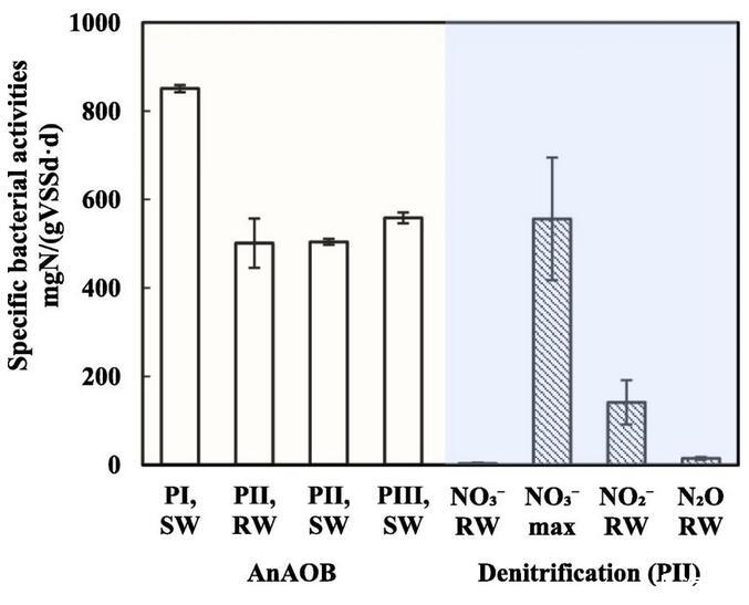 圖2 AnAOB的特定細(xì)菌活性和異養(yǎng)反硝化作用。PI:第一期;PII:第二期;PIII:第三期;SW:合成廢水;RW:消化液。