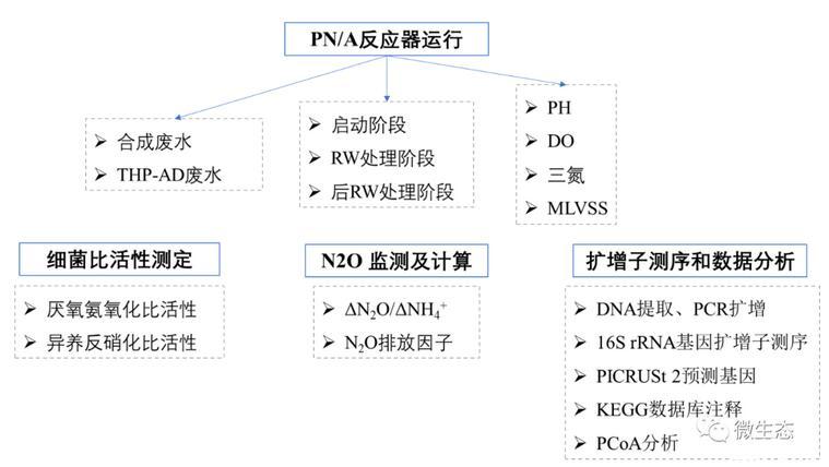 本研究的N2O排放因子(0.88~1.31%)與之前對不添加COD的一階段PN/A工藝處理合成廢水的研究和處理廢水(1.2%~2%的進(jìn)水TN)相當(dāng)。PN/A工藝中N2O產(chǎn)生的來源主要包括:(1)異養(yǎng)反硝化菌的異養(yǎng)反硝化作用;(2)AOB硝化作用;(3)AOB的硝化反硝化作用。唯一的生物N2O消耗途徑是異養(yǎng)反硝化菌的異養(yǎng)N2O還原。對于不添加COD的PN/A工藝,AOB被認(rèn)為是N2O的主要生產(chǎn)者;而與AOB相比,HB在N2O產(chǎn)生中的作用似乎微不足道。相比之下,以往的研究表明,在存在可生物降解有機(jī)物時,異養(yǎng)N2O生產(chǎn)為普遍途徑。因此,AOB可能是用合成廢水供給時PN/A反應(yīng)器中N2O的主要生產(chǎn)者,異養(yǎng)N2O途徑可能在處理RW時得到促進(jìn)。我們的結(jié)果表明,RW中的N2O排放量略低于合成水,因?yàn)楫愷B(yǎng)N2O途徑受到THP-AD廢水的影響。Zhu和Chen(2011)報道了污泥RW降低了好氧-缺氧反應(yīng)器的N2O和NO排放,推測污泥廢水中的Cu2+和丙酸增加了N2O還原酶活性與NO還原酶活性的比率,導(dǎo)致N2O排放量減少。同時,廢水中的有機(jī)物可能會改變異養(yǎng)N2O生成和消耗途徑的平衡。據(jù)報道,廢水的低COD/N(0.4)增加了硝化反應(yīng)器中N2O的生成,而充足的有機(jī)物供應(yīng)減少了好氧-缺氧反應(yīng)器和PN/A反應(yīng)器中N2O的排放。因此,異養(yǎng)N2O途徑受THP-AD廢水組分的影響。