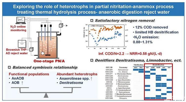 異養(yǎng)細(xì)菌(HB)普遍存在于厭氧氨氧化工藝中,但其在部分硝化-厭氧氨氧化(PN/A)工藝處理高有機(jī)物廢水中的功能和生態(tài)作用仍未清楚。本研究旨在闡明單級PN/A處理熱水解工藝(THP)-厭氧消化(AD)廢水中的HB活性及其微生物相互作用。PN/A反應(yīng)器實(shí)現(xiàn)了令人滿意的氮去除率,高達(dá)0.58±0.06 g N/(L·d),同時THP-AD廢水中的COD去除率約12%。PN/A反應(yīng)器的N2O排放因子為1.15%±0.18%(處理合成廢水)和0.95%±0.06%(處理消化液)。在反應(yīng)器運(yùn)行過程中,HB和功能微生物(即厭氧氨氧化細(xì)菌和好氧氨氧化細(xì)菌)之間保持著平衡的共生關(guān)系。Anaerolineae spp.的相對豐度明顯增加,而反硝化菌Denitratisoma在處理THP-AD廢水時略有減少。異養(yǎng)生物對電子供體的偏好解釋了增長趨勢的差異。