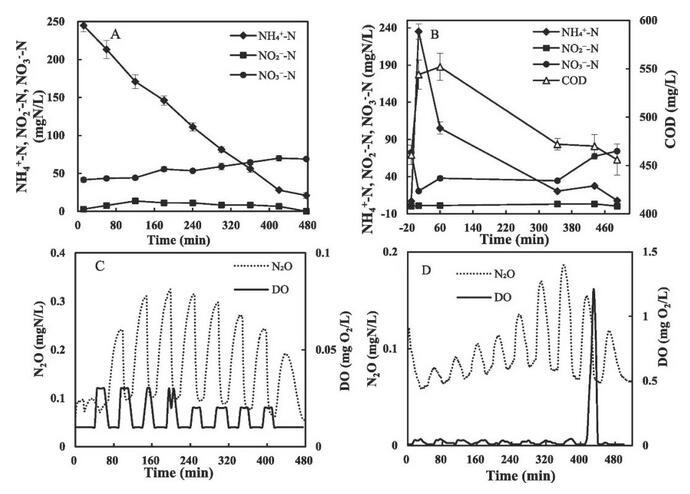 圖3 SBR循環(huán)過程中PN/A反應(yīng)器的氮形式和N2O排放分布。A、C:處理合成廢水。B、D:處理THP-AD廢水。