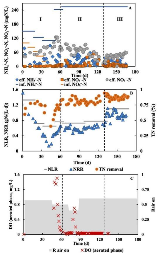 圖1 PN/A反應(yīng)器性能。A:進(jìn)水和出水中的含氮物質(zhì)。B:氮負(fù)荷和氮去除。C:Rair on(反應(yīng)期間供應(yīng)空氣的時間百分比)和DO。