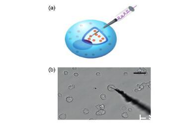 圖10頂端納米尺寸的碳纖維微電極檢測單個腎上腺嗜鉻細胞瘤細胞顯微鏡圖[14]。(a)示意圖(橙色的小圓圈代表囊泡);(b)尖端為納米尺寸的圓錐形的碳纖維微電極檢測單個腎上腺嗜鉻細胞瘤細胞顯微鏡圖