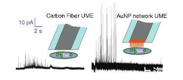 圖8碳纖維微電極與金納米顆粒網(wǎng)狀電極檢測單細胞胞外釋放的多巴胺[62]
