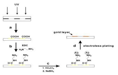 圖2在聚苯乙烯薄片上制備電極的步驟圖解[10]。(a)紫外照射;(b)氨基;(c)金納米粒子;(d)金層