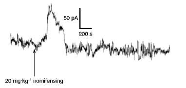 圖6全氟磺酸修飾金納米粒子玻璃毛細管實時檢測鼠腦中的多巴胺含量[58]。通過注射20mg·kg-1的氨苯甲異喹使鼠麻醉,使用全氟磺酸修飾金納米粒子玻璃毛細管實時監(jiān)測鼠腦中多巴胺含量的I?t圖。箭頭顯示氨苯甲異喹的注射時間