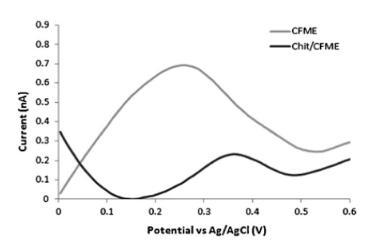 圖4未修飾的碳纖維微電極和殼聚糖包被的碳纖維微電極在活體檢測后的微分脈沖伏安圖[57]