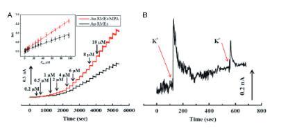 圖53?巰基丙酸修飾的金環(huán)微電極記錄鼠腦紋狀體中兒茶酚胺的釋放量[12]。(A)在0.2V電壓下修飾3?巰基丙酸之前(黑線)和修飾3?巰基丙酸之后(紅線)檢測多巴胺的I?t圖;(B)3?巰基丙酸修飾的金環(huán)微電極記錄鼠腦紋狀體中兒茶酚胺的釋放