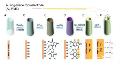 圖1金環(huán)微電極的制作步驟[12]。(A)拉制好的空玻璃毛細管;(B)毛細管內(nèi)壁羥基化;(C)毛細管內(nèi)壁自組裝上聚多巴胺層;(D)內(nèi)壁生長金納米粒子;(E)形成金膜;(F)金環(huán)微電極尖端修飾3?巰基丙酸