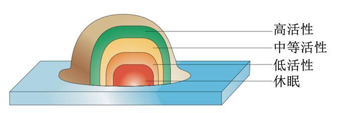 細菌所處微環境的pH和氧化還原電位等不同,可使遺傳學上一致的細菌個體表現不同的特性,如產生毒素不同可使生物膜中一些細菌個體對宿主無危害,而另一些細菌則可能對宿主有致命威脅。因此,不均質性是細菌生物膜的另一個重要特性,也與細菌的抗性有關。有研究表明,生物膜中的營養物質、氧和代謝產物濃度呈現出一種自外向內的下降趨勢[24]。這種特殊的微環境和營養條件導致位于生物膜頂部的細胞具有較好的代謝活性,而其他細菌則處于穩定期或生長緩慢[12](圖3),從而降低了對抗菌藥物的敏感性。部分抗菌藥物可以殺滅最外層敏感性較高的細菌,但只能部分殺滅或無法殺滅敏感性低的細菌。而死亡細菌會成為殘存細菌的營養來源,從而形成新的生物膜。
