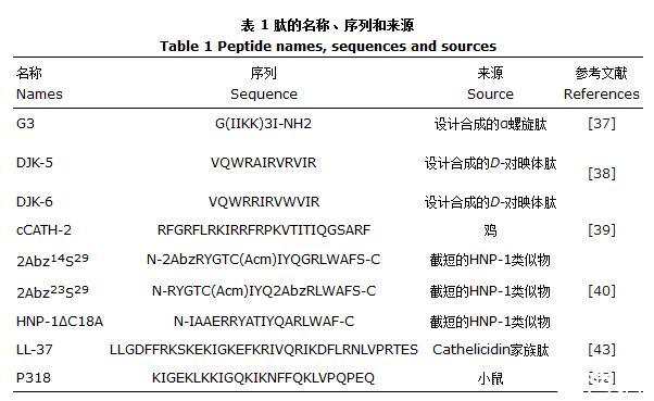 AMPs具有良好的抗生物膜活性,可以抑制和清除生物膜[35-36]。與傳統抗生素相比,AMPs不易產生耐藥性,是極具潛力的抗生素替代物。如螺旋肽G3可以干擾變形鏈球菌生物膜形成的不同階段來抑制變異鏈球菌生物膜的形成。在初始階段,G3通過降低細菌表面電荷、疏水性、膜完整性和黏附相關基因轉錄來抑制細菌黏附。在后期,G3與EPS中的eDNA相互作用,破壞成熟生物膜的3D穩定性結構,從而分散它們。因此,G3在預防和治療變形鏈球菌生物膜感染方面表現出了巨大的應用潛力[37]。在銅綠假單胞菌生物膜開始生長時添加肽DJK-5和DJK-6,能夠抑制生物膜的形成;在生物膜的結構已經明顯時,DJK-5和DJK-6可以分散和根除成熟生物膜中的細菌[38]。肽cCATH-2對浮游菌和生物膜內細菌有快速殺滅能力,可以減少細菌最初附著和其他階段的生物量[39]。Moazzezy等[40]發現,3種人中性粒細胞肽類似物均顯示出對大腸桿菌生物膜的抑制和根除作用??咕腖L-37在濃度遠小于其MIC時即可破壞鮑曼不動桿菌生物膜,且隨著LL-37濃度的增加,生物膜呈現出遞減的趨勢[41]。P318在0.15μmol/L時可以抑制白色念珠菌生物膜的形成[42]。上述肽的序列和來源詳見表1。