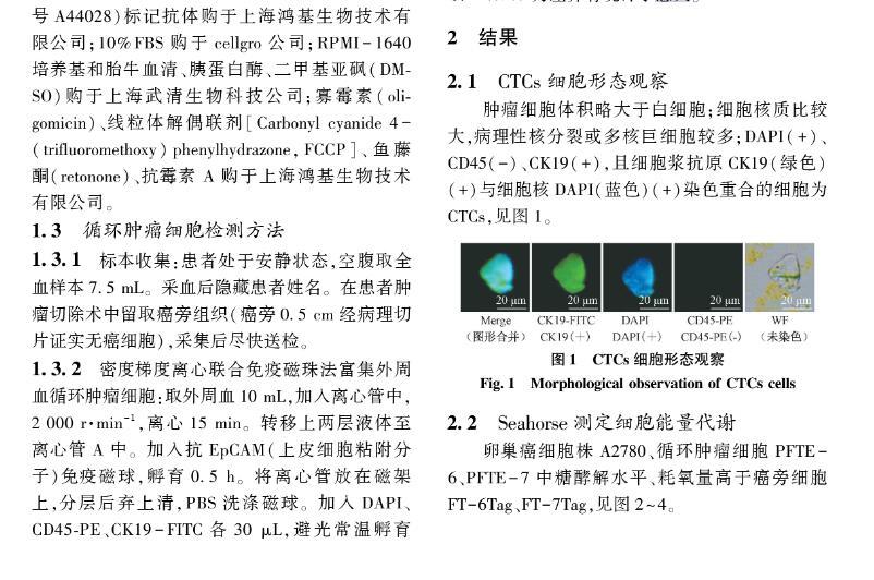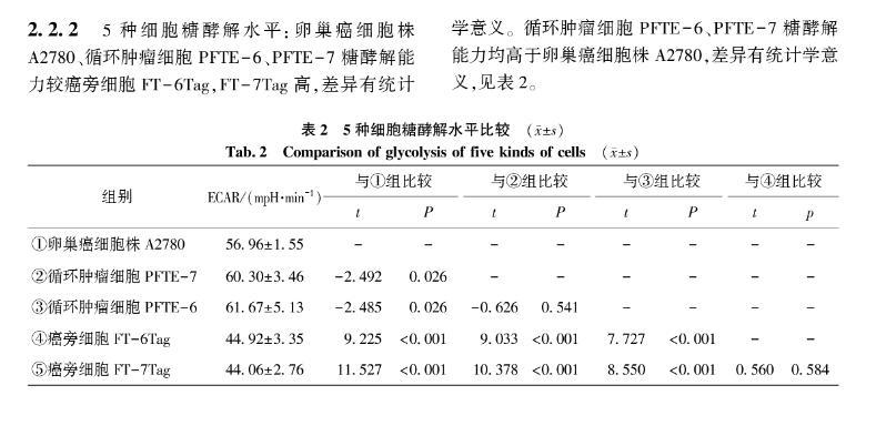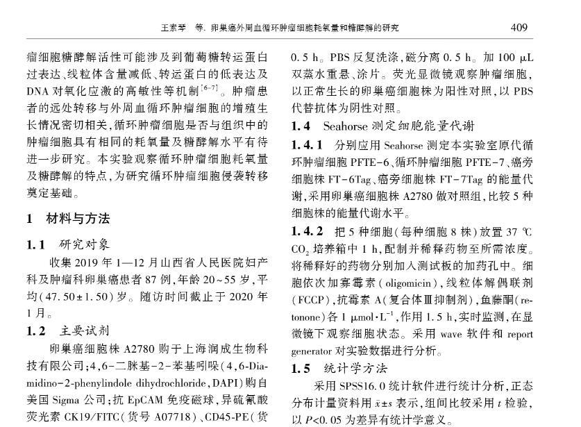 目的:觀察卵巢癌患者外周血循環(huán)腫瘤細(xì)胞耗氧量和糖酵解情況。方法:收集87例卵巢癌患者,應(yīng)用密度梯度離心聯(lián)合免疫磁珠富集法篩選卵巢癌患者外周血中的循環(huán)腫瘤細(xì)胞,用Seahorse檢測(cè)循環(huán)腫瘤細(xì)胞及癌旁細(xì)胞的耗氧量和糖酵解水平。結(jié)果:卵巢癌細(xì)胞株A2780糖酵解水平(56.96±1.55)mpH·min~(-1)、循環(huán)腫瘤細(xì)胞PFTE-6糖酵解水平(61.67±5.13)mpH·min~(-1)和循環(huán)腫瘤細(xì)胞PFTE-7糖酵解水平(60.30±3.46)mpH·min~(-1)均高于癌旁細(xì)胞FT-6Tag(44.92±3.35)mpH·min~(-1)、癌旁細(xì)胞FT-7Tag(44.06±2.76)mpH·min~(-1)(P0.05),卵巢癌細(xì)胞株A2780耗氧量(259.42±14.75)pmol·min~(-1)、循環(huán)腫瘤細(xì)胞PFTE-6耗氧量(209.01±4.20)pmol·min~(-1)和循環(huán)腫瘤細(xì)胞PFTE-7耗氧量(248.03±9.46)pmol·min~(-1)高于癌旁細(xì)胞FT-6Tag(172.43±13.14)pmol·min~(-1)、癌旁細(xì)胞FT-7Tag(124.29±7.82)pmol·min~(-1)(P0.05)。結(jié)論:循環(huán)腫瘤細(xì)胞的耗氧量及糖酵解較癌旁細(xì)胞強(qiáng)。