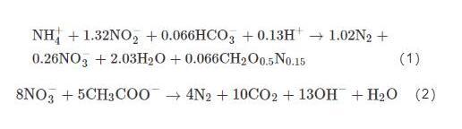 但也有另外一些學者認為,NH4+-N不能被直接轉化。因此,關于NH4+-N能否成為BES系統的電子供體尚無定論。此外,另外一種陽極氨氧化的途徑是厭氧氨氧化,其以NH4+-N和NO2--N為底物,將氮素轉化為氮氣,此種方法被認為是陽極氨氧化的主要途徑(式1)。陽極異養反硝化脫氮則以傳統的生物反硝化為基本原理,將NO3--N還原為N2(式2),其適用于高碳氮比廢水的脫氮處理。