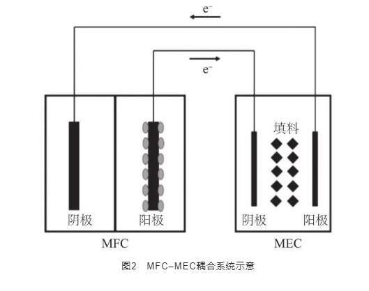 其中,MFC-MEC耦合系統以其耗能小、脫氮效果良好成為當前BES領域的研究熱點之一。該耦合系統將MFC的陽極、陰極分別與MEC的陰極、陽極相連,作為直流電源驅動MEC,裝置如圖2所示。直流電驅動BES反應器(即MEC系統)可以實現較高的反硝化速率,但耗能也較高,而利用MFC驅動可直接利用有機物中的電能,并以微電流的形式施加至MEC,刺激MEC中脫氮微生物的活性,大大降低了能耗及運行成本。