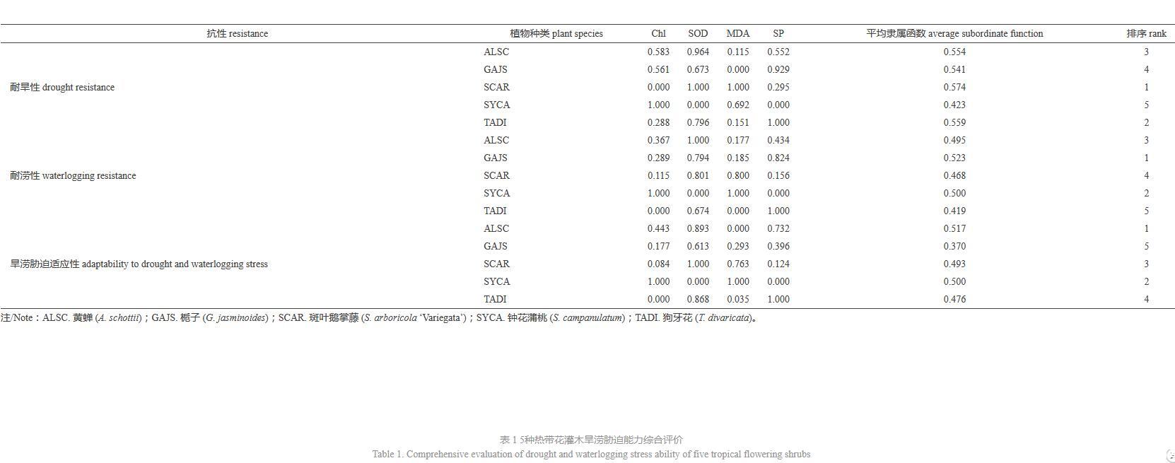 表1 5種熱帶花灌木旱澇脅迫能力綜合評價