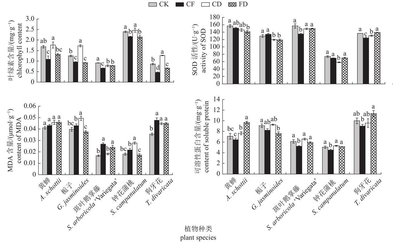 由圖1可知:CF組中5種花灌木的葉綠素總量都顯著下降(P<0.05),其中狗牙花下降幅度最大,為46.00%,鐘花蒲桃下降幅度最小,為9.69%。CD組中斑葉鵝掌藤的葉綠素總量降低了14.49%,與CK組差異顯著(P<0.05);而其他4種花灌木的葉綠素總量則升高,其中狗牙花和梔子顯著高于CK組(P<0.05)。FD組中5種花灌木葉綠素總量都降低,黃蟬、梔子、斑葉鵝掌藤、鐘花蒲桃和狗牙花的葉綠素總量分別降低了21.59%、25.80%、13.58%、10.30%和23.02%。