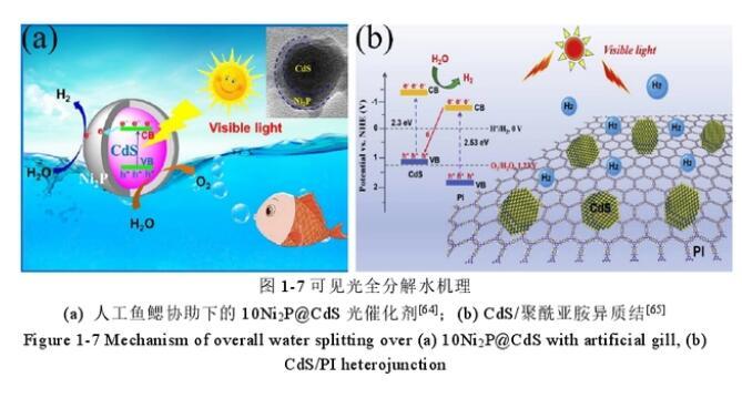在金屬硫化物光催化劑中,導(dǎo)帶由過渡金屬d軌道組成,價帶則由S 3p軌道組成。由于S元素相比于O元素具有更小的電負性,因此含有同樣過渡金屬的金屬硫化價帶相比于金屬氧化物的價帶更負,導(dǎo)致了金屬硫化物的禁帶寬度小于其金屬氧化物的禁帶寬度,因此金屬硫化物相比于金屬氧化物具有更寬的光吸收范圍。盡管金屬硫化物滿足可見光分解水制氫的熱力學(xué)條件,但是由于其S2-陰離子容易被光氧化,導(dǎo)致了金屬硫化物光穩(wěn)定性較差,制約了其實際應(yīng)用。目前,ZnS、CdS和MoS2等金屬硫化物廣泛受到研究。其中,雖然ZnS能夠被用于光催化分解水制氫,但是其較大的禁帶寬度(3.66 eV)決定了其只能吸收紫外光。通過與其他同構(gòu)的寬光譜吸收的金屬硫化物形成固溶體,可以有效的拓展ZnS光吸收范圍,從而達到提升其光催化活性的目的。當前金屬硫化物的研究主要集中在提高其抗光腐蝕和循環(huán)穩(wěn)定性。例如,Lu等人通過在CdS光催化反應(yīng)體系中加入人工魚鰓(圖6所示),對光催化反應(yīng)過程中分解水產(chǎn)生的O2進行了消耗,從而避免了CdS被氧化,增強了其抗光腐蝕能力和光穩(wěn)定性。同時由于Ni2P作為光催化分解水產(chǎn)氫助催化劑的加入,促進了光生載流子的分離,使得10Ni2P CdS在430 nm單色光輻照下,實現(xiàn)了3.89%的光催化全解水表觀量子效率。Wang等人通過構(gòu)建CdS/聚酰亞胺Z型異質(zhì)結(jié)(如圖6所示),將CdS價帶上的空穴成功中和,避免了S2-陰離子被空穴氧化,從而大幅提高了CdS/聚酰亞胺異質(zhì)結(jié)材料的光穩(wěn)定性。