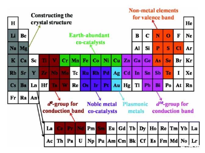 迄今為止,為了尋找制備簡單、高效穩(wěn)定、環(huán)境友好的光催化劑,已經(jīng)有成百上千種半導(dǎo)體被作為光催化劑,實現(xiàn)了紫外/可見光輻照下光催化分解水制氫/制氧。各種分解水半導(dǎo)體光催化劑的元素組成在元素周期表中顯示如下圖4所示。按照其元素組成可以分:單質(zhì)光催化劑、金屬氧族化物光催化劑、金屬碳氮化物(MXenes)光催化劑、金屬有機框架化合物光催化劑、共價有機框架化合物光催化劑以及石墨相氮化碳光催化劑。