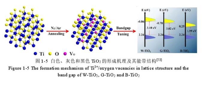 一般來說,金屬氧族半導(dǎo)體化合物按其組成可以分為金屬氧化物和金屬硫化物。常見的金屬氧化物半導(dǎo)體主要由過渡金屬元素與氧元素組成,如TiO2、ZnO、Cu2O和Fe2O3。按照其光吸收范圍,金屬氧化物半導(dǎo)體可以分為禁帶寬度大于3.0 eV的紫外光活性的光催化劑(如TiO2和ZnO)和禁帶寬度小于3.0 eV的紫外-可見光活性的光催化劑(如Cu2O和Fe2O3)。對于紫外光響應(yīng)型半導(dǎo)體材料,盡管其在紫外光輻照下具有光催化活性,但其只能吸收占太陽光譜5%的紫外光,極大的限制了其應(yīng)用。因此,目前針對TiO2和ZnO半導(dǎo)體材料的改性,主要是為了增加其在可見光范圍內(nèi)的光吸收。理論上講,可以通過調(diào)變價帶頂電勢使其更負,或者調(diào)變導(dǎo)帶底電勢使其更正,或者在禁帶寬度中引入雜質(zhì)能級,從而實現(xiàn)禁帶寬度的縮小,提高TiO2和ZnO半導(dǎo)體可見光利用率。例如,Du等人通過將白色的TiO2在不同的氣體氛圍中煅燒,成功制備出不同O空位濃度的TiO2。結(jié)果如下圖5所示,由于O空位的逐漸增大,使得TiO2的導(dǎo)帶位從-0.86 eV下移到-0.78 eV至0.25 eV,而價帶頂電勢不變,說明O空位越多TiO2禁帶寬度越小,從而增大了其在可見光范圍內(nèi)的吸收,極大提高了TiO2的光催化NO移除活性。