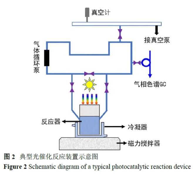 由于空氣中存在大量的氧氣,考慮到氧氣的檢測對評價光催化反應(yīng)十分重要,因此在測試光催化反應(yīng)過程中一定要避免空氣干擾。常用于測試光催化活性的裝置可分為兩種,一種是閉路循環(huán)系統(tǒng)(圖2),在該系統(tǒng)中,光催化劑分散在反應(yīng)器的溶液中,整個反應(yīng)系統(tǒng)被抽真空以消除空氣的影響,待空氣清除完成后,光源(如高/中/低壓汞燈、氙燈、鹵素?zé)簟ED燈、發(fā)光二極管等)從頂部、側(cè)部或內(nèi)部照射;另一種是開放流動系統(tǒng),惰性氣體連續(xù)地流過反應(yīng)體系將生成的氣體一起帶入到檢測器中。用于光催化反應(yīng)性能評價的反應(yīng)器系統(tǒng)應(yīng)安裝冷卻循環(huán)水確保反應(yīng)在室溫下進行,以避免可能發(fā)生的熱催化過程或熱效應(yīng)對反應(yīng)性能的影響,具體原因如下所述。