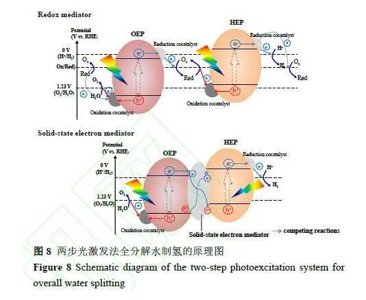 在以氧化-還原電對為電子傳輸介質(zhì)的Z體系中,如何控制反應(yīng)的選擇性是一個重要課題。從熱力學(xué)來看,氧化-還原電對的還原電位比質(zhì)子的還原電位更正,同時氧化電位比水的氧化電位更負(圖8),這使得其氧化與還原更容易進行。因此,盡管已經(jīng)開發(fā)了大量可見光響應(yīng)的光催化材料,但真正在可見光下表現(xiàn)出活性的Z機制全分解水體系數(shù)量十分有限。