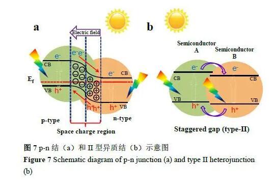除了體相的電荷分離,抑制遷移到表面后的電荷復(fù)合同樣重要。在這方面,表界面調(diào)控是重要的策略。例如:利用ZrO2修飾TaON可減少表面的低價Ta缺陷,抑制表面電子和空穴的復(fù)合。此外,構(gòu)建復(fù)合結(jié)構(gòu)也是促進電荷分離的有效途徑,當兩種不同物相或?qū)煞N物相相同而晶相不同的半導(dǎo)體進行復(fù)合,可構(gòu)建異質(zhì)結(jié)或異相結(jié)復(fù)合光催化劑。其基本工作原理是當兩種不同的介質(zhì)緊密接觸時會形成“結(jié)”,在結(jié)的兩側(cè)由于其能帶等性質(zhì)的不同會形成空間電勢差,這種空間電勢的存在會形成內(nèi)建電場,加速電子-空穴的分離。傳統(tǒng)太陽能電池中通過利用p型和n型半導(dǎo)體之間的能級差構(gòu)筑p-n結(jié)促進電荷分離,在光催化體系中也借鑒p-n結(jié)思想,通過類似的原理構(gòu)筑異相結(jié)或異質(zhì)結(jié)來達到分離電荷和提高光催化性能的目的(如圖7所示)。通常,半導(dǎo)體-半導(dǎo)體異質(zhì)結(jié)系統(tǒng)可以分為兩種不同的類型:p-n型和n-n或p-p型。在過去的幾十年中,成功設(shè)計和合成了例如p型CaFe2O4和n型PbBi2Nb1.9W0.1O9、p型CaFe2O4和n型MgFe2O4異質(zhì)結(jié)提高電荷分離效率。然而,由于p型半導(dǎo)體的數(shù)量有限且穩(wěn)定性較差,構(gòu)建成功的p-n結(jié)數(shù)量也相當有限,更為常見的是n-n結(jié)。例如:TiO2/CdS、BiVO4/WO3等都被證明可以提升光催化性能。該系統(tǒng)中,半導(dǎo)體之間接觸界面的設(shè)計和控制在促進電荷分離方面起著至關(guān)重要的作用。對于基于氧化物的異質(zhì)結(jié),加熱或水熱處理可以提供緊密的界面接觸。然而,對于具有優(yōu)異吸光性能的(氧)氮化物來說,其空氣或惰性氣體中的熱穩(wěn)定差使得異質(zhì)結(jié)構(gòu)筑較為困難。為了解決這個問題,我們團隊開發(fā)了一鍋氮化策略在兩個含氮半導(dǎo)體之間構(gòu)筑異質(zhì)結(jié)構(gòu),該策略不僅有效地避免了在空氣中的熱處理,而且氨氣氛圍下的高溫焙燒也有利于產(chǎn)生緊密的異質(zhì)界面以增強界面電荷分離。此外,半導(dǎo)體和助催化劑之間的界面工程也極大地影響了光催化性能。通過MgO納米層(2-5nm)界面改性,Ta3N5的表面從疏水變?yōu)橛H水,助催化劑在親水表面的均勻分散大大改善了助催化劑與Ta3N5的界面接觸,促進光生電荷分離和水分解性能。