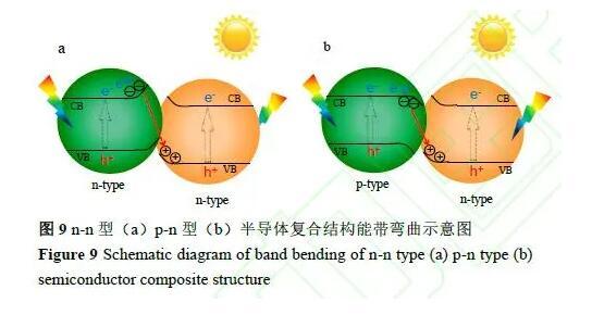 Z機制中產(chǎn)氫光催化劑與產(chǎn)氧光催化劑間的電荷傳輸還可通過固態(tài)電子傳輸介體實現(xiàn)。在這種情況下,主要挑戰(zhàn)來源于產(chǎn)氫光催化劑、產(chǎn)氧光催化劑和固體電子傳輸介質(zhì)之間的界面電荷轉(zhuǎn)移,并需有效抑制短路電流的產(chǎn)生。目前已經(jīng)探索出多種金屬(Ir、Ag、Au、Rh、Ni、Pt)、還原氧化石墨烯(RGO)和碳點作為構(gòu)建全固態(tài)Z機制全分解水的固態(tài)電子傳輸介質(zhì)。日本Domen課題組基于此發(fā)展了光催化劑片,該系統(tǒng)在419 nm下的AQY值為33%,STH超過1%,為目前文獻報道最高的STH值,其工作原理類似于光陽極與光陰極的串聯(lián)耦合,可認為是微型化的雙光照光電極器件,如在該體系中SrTiO3:Rh/La可認為是光電陰極,BiVO4:Mo可認為是光電陽極,Au可認為是導(dǎo)線把他們串聯(lián)連接起來。值得注意的是,只有光陰極電流和光陽極電流之間有電位的重疊,才能實現(xiàn)有效的電荷傳輸和雙光電極直接全分解水制氫,否則雙光照電極之間的電荷傳輸和水分解反應(yīng)是無法滿足熱力學(xué)要求而實現(xiàn)的。同理,對于光催化粉末體系而言,構(gòu)筑直接Z型光催化全分解水制氫體系同樣需要考慮其光生電子空穴傳輸?shù)臒崃W(xué)和動力學(xué)可行性,即驅(qū)動力在哪?根據(jù)光電極的工作原理和不同類型半導(dǎo)體(p型、n型)的能帶彎曲理論,兩種半導(dǎo)體之間要想實現(xiàn)電子和空穴的直接復(fù)合需要滿足能帶彎曲所能驅(qū)動的方向,兩種n型半導(dǎo)體復(fù)合在一起原理上是不能通過能帶彎曲實現(xiàn)直接復(fù)合的(n型半導(dǎo)體能帶彎曲的方向相同),而只有p型與n型的結(jié)合才能依靠能帶彎曲的不同方向?qū)崿F(xiàn)兩種半導(dǎo)體之間電子和空穴的直接復(fù)合(如圖9所示)。對于二步法全分解水體系,制約其量子效率提升的瓶頸問題在于如何提升產(chǎn)氫端/產(chǎn)氧端的電荷分離以及抑制該體系中競爭反應(yīng)的發(fā)生使得電荷定向應(yīng)用到質(zhì)子還原與水氧化反應(yīng)中。這不僅與半導(dǎo)體自身的結(jié)構(gòu)有關(guān),也與助催化劑的選擇性催化、助催化劑/半導(dǎo)體的界面結(jié)構(gòu)等息息相關(guān)。