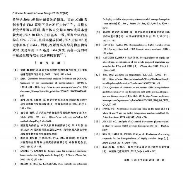 國內(nèi)可見介紹RSABE理論的文獻(xiàn)報(bào)道[3,6],本研究主要通過模擬研究和實(shí)例分析來對比FDA和EMA提出的RSABE方法,旨在為相關(guān)從業(yè)人員提供方法學(xué)的指導(dǎo)。
