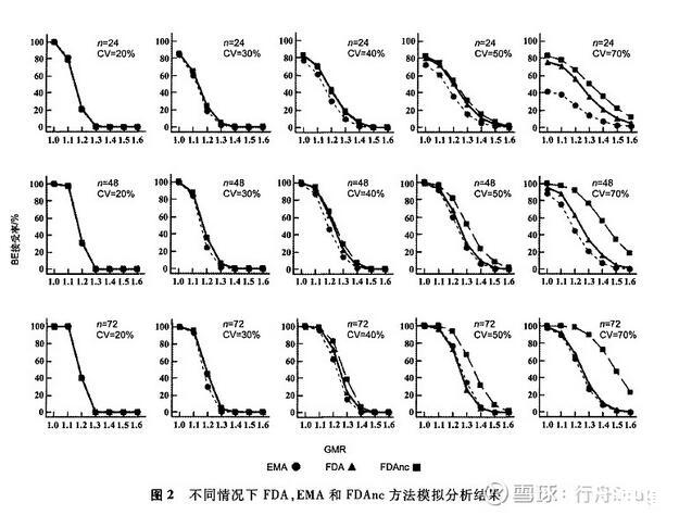 隨著樣本量的增加,2種方法的BE通過率都有提升,但是對EMA方法的提升更加突出。FDA的RSABE等效判定時(shí),GMR點(diǎn)估計(jì)值在0.8~1.25是重要的限制條件,模擬研究表明,尤其當(dāng)變>50%,樣本量較大時(shí),F(xiàn)DAnc方法的BE通過率要遠(yuǎn)大于EMA和FDA方法,這就可能出現(xiàn)兩制劑均值差異達(dá)50%,但結(jié)論卻等效的情況。因此,GMR限制條件在FDA原則下是必不可少的[11,16]。從模擬研究結(jié)果可以看到,當(dāng)個(gè)體內(nèi)變異≤30%或樣本量較大時(shí),F(xiàn)DA和EMA方法基本一致,而當(dāng)個(gè)體內(nèi)變異在40%~70%,且樣本量較低時(shí),F(xiàn)DA方法BE通過率要高于EMA。因此,在評(píng)價(jià)高變異藥物生物等效時(shí),無論采用FDA還是EMA方法,具備一定的樣本量是生物等效研究成功的前提[17]。
