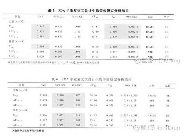 分析結(jié)果顯示:FDA原則下,空腹試驗(yàn)的藥動(dòng)學(xué)參數(shù)指標(biāo)及餐后試驗(yàn)的Cmax個(gè)體內(nèi)標(biāo)準(zhǔn)差均>0.294,采用RSABE方法,這些藥動(dòng)學(xué)參數(shù)指標(biāo)95%UCB均小于0,且GMR點(diǎn)估計(jì)值在0.8~1.25界限內(nèi)。餐后試驗(yàn)AUC指標(biāo)采用ABE估計(jì)90%置信區(qū)間,均在0.8~1.25等效界限內(nèi)。綜上可認(rèn)為兩制劑生物等效。依據(jù)EMA原則,最終分析結(jié)論一致。但EMA只在Cmax個(gè)體內(nèi)標(biāo)準(zhǔn)差>0.294時(shí),采用RSABE方法,AUC指標(biāo)仍使用ABE方法。此外,從置信區(qū)間來看,EMA和FDA的差別不大。