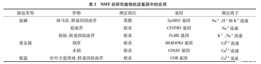 NMT在研究植物抗逆基因中的應用見表2。Fan等將海馬齒(Sesuviumportulacastrum)的SpAHA1基因轉錄入擬南芥中,使用NMT測定質膜中Na+、H+和K+的流速,結果顯示,SpAHA1蛋白在胞質膜上具有H+-ATPase的功能,SpAHA1蛋白通過增加質子的電化學梯度來降低Na+的積累,促進質膜上Na+/H+反向運輸體的交換活性,在植物抵抗鹽堿逆境中起著十分重要的作用[16]。擬南芥CYSTM3在耐鹽脅迫方面起著負調控作用是Xu等運用NMT發現的,CYSTM3基因可以抑制擬南芥根系Na+外排,抑制一系列活性氧清除酶的活性[17]。Zhang等同樣研究了轉基因擬南芥,來自胡楊的PeJRL基因在NaCl脅迫下轉基因植株保留了K+,限制了Na+的積累[18]。PeJRL轉基因株系增加了Na+的外排量,這與編碼細胞膜SOS1、AHA1和AHA2基因的上調有關。PeJRL過表達植物中活化的H+-ATPases抑制了由NaCl誘導的去極化激活的K+通道介導的損失。此外,Cd2+借用Cu2+通道、Cu2+激活Ca2+通道等,均是Cd2+吸收增加的潛在機制。Zhang等的研究表明,MhMAPK4基因過表達降低了煙草根中Cd2+的凈流入量,轉基因煙草中Cd2+流入到穩定狀態的恢復時間也比野生型煙草短,MhMAPK4過表達降低了煙草根細胞的死亡和凋亡,MhMAPK4通過調節根對Cd2+的吸收來調節Cd的積累,通過調節液泡加工酶(VPE)的活性來控制Cd引起的細胞死亡[19]。Ma等鑒定了粳稻抗寒性的數量性狀位點為COLD。過表達COLD1基因可顯著提高水稻的抗寒性,而缺乏或低表達COLD1基因的水稻對寒冷敏感。COLD1編碼定位于細胞膜,是內質網的G蛋白信號調節因子。它與G蛋白相互作用,激活Ca2+通道感知低溫,加速G蛋白GTPase活性,使水稻具有抗寒性[20]。Zhou等使用NMT分析顯示,轉基因擬南芥根在冷沖擊下Ca2+內流增加。在冷脅迫下,胞質Ca2+作為信號分子的增加激活了下游COR基因的表達。因此,Ca2+的流入可能導致轉基因擬南芥COR基因表達增加[21]。