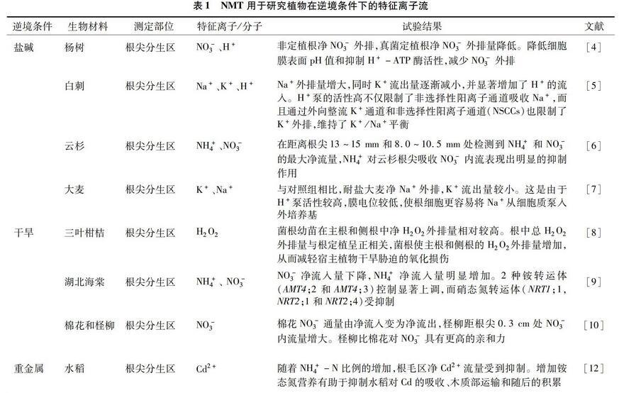 植物在遭遇逆境時會有一系列的生理生化反應,從而表現出各種特有的響應和調節機制。細胞膜透性和功能的改變是植物對逆境條件最為直接和快速的響應[4],進而才是在細胞器或細胞質中進行的同化、代謝等生理過程。因此,從逆境條件下植物與外界環境之間的界面反應著眼,探索界面上特征離子或關鍵離子的流動速度和方向變化,對研究植物的逆境生理具有極為重要的意義。研究者們已對鹽漬、干旱、重金屬的脅迫方面進行了廣泛的研究,所采用的生物材料、特征離子和測定部位等列于表1。