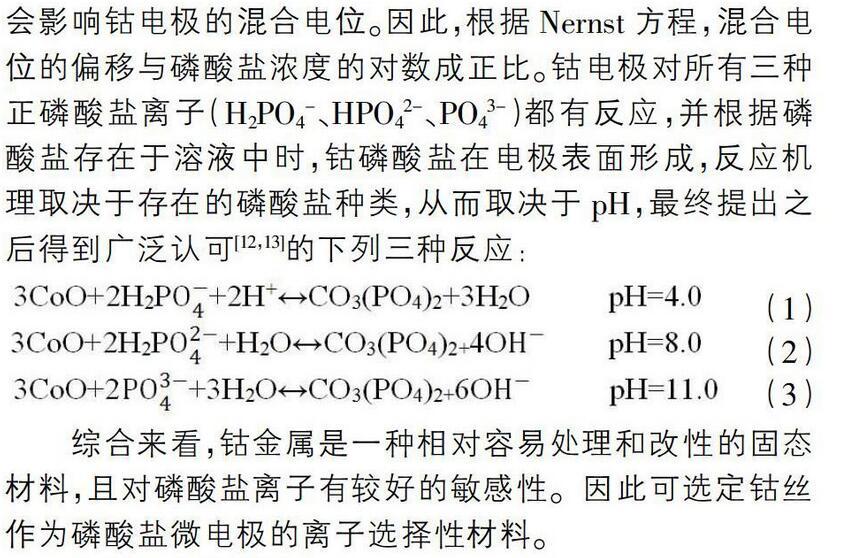 BiPO4-薄膜[7]、核苷磷酸化酶和黃嘌呤氧化酶共固定化的雙酶膜[8]、二氯化二芐基錫衍生物[9]等都曾用作磷酸鹽選擇性電極的離子選擇材料。與此同時,一種簡單的鈷基磷酸鹽微電極在制藥、生物醫(yī)學研究、臨床化學以及工業(yè)和環(huán)境監(jiān)測等領域得到廣泛應用。根據(jù)Xiao等[10]的研究,純鈷絲對磷酸鹽離子表現(xiàn)出相對選擇性的電位響應,并從氧化鈷的主客體化學討論了磷酸鹽電極的響應機制。Meruva等[11]表明電位響應來源于鈷的緩慢氧化和電極表面氧和Co2+的同時還原產(chǎn)生的混合電位,更準確地解釋了氧化鈷電極在磷酸鹽和氧氣存在下的行為。磷酸鈷的形成會影響鈷電極的混合電位。因此,根據(jù)Nernst方程,混合電位的偏移與磷酸鹽濃度的對數(shù)成正比。鈷電極對所有三種正磷酸鹽離子(H2PO4-、HPO42-、PO43-)都有反應,并根據(jù)磷酸鹽存在于溶液中時,鈷磷酸鹽在電極表面形成,反應機理取決于存在的磷酸鹽種類,從而取決于pH,最終提出之后得到廣泛認可[12,13]的下列三種反應: