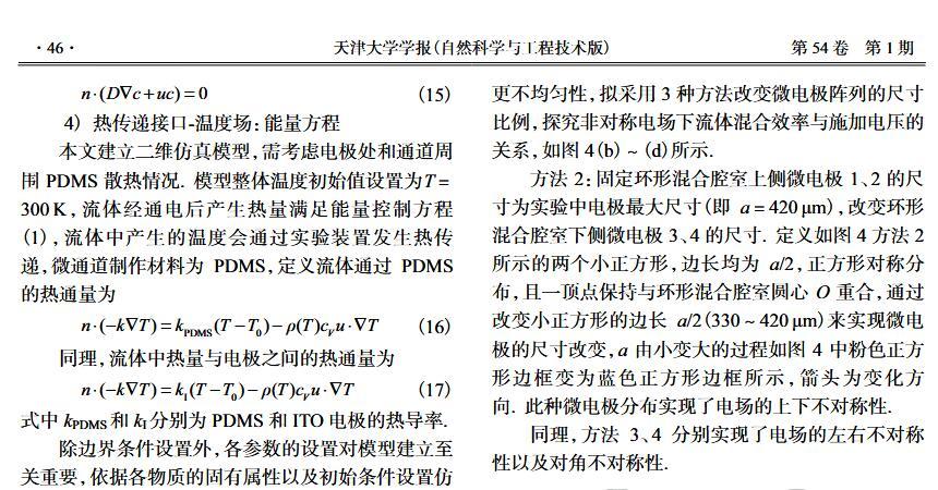 【摘要】:微流體交流電熱效應混合是縮短藥物篩選時間的有效手段之一。混合機制通常由微電極誘導流體內部產生溫度梯度,從而形成渦流用于整個樣品區域內的流體攪拌.但生物流體電導率偏高,交流電熱的溫升容易影響藥物活性。因此,設計并封裝一款環形微流體混合芯片,在不損失混合效率的前提下抑制流體的溫升,揭示該芯片的混合性能,數值模擬與實驗對微通道內兩相流體的動態混合過程進行定量分析,并對模型幾何參數、物理參數等條件進行優化研究.首先,利用Comsol仿真軟件進行電場、溫度場、流場以及稀物質傳輸場的強耦合仿真計算,以混合效率為目標函數,同時以溫升上限作為約束條件,優化電壓幅值以及微電極陣列的尺寸和分布。仿真結果表明,在給定電壓下弧形微電極陣列的分布模式以及尺寸大小是影響混合效率的主要因素,電極對稱/非對稱分布誘導不同形式的非勻強電場空間分布,電極尺寸直接影響電場對流體的作用力范圍。綜合溫升研究,仿真最優混合效率可達98.67%。然后,以優化的電極尺寸參數加工氧化煙錫微電極陣列,軟光刻加工聚二甲基硅氧烷微通道。將上述帶有特定微通道圖案的PDMS與微電極玻璃基底封裝后形成最終的微混合實驗芯片。最后,使用電導率為0.2 S/m的藍色染料溶液和去離子水緩沖液(經0.9%NaCl溶液調節電導率值)進行混合實驗,微混合器混合效率可達93.16%。