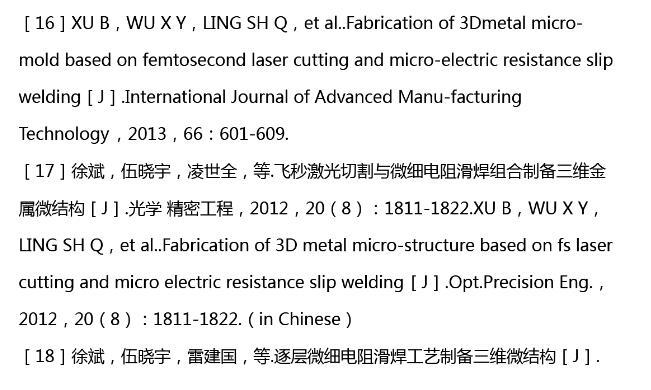 【摘要】:研究了三維微型腔模具的制備方法。該方法基于微型雙工位分層實體制造工藝(DLOM),通過多層銅箔二維微結構疊加擬合出三維隊列微電極,將制備的微電極用于微細電火花加工來制得三維微型腔模具。首先,利用線切割對100μm厚的多層銅箔進行逐層切割,獲得多層二維微結構。然后,通過真空壓力熱擴散焊對多層銅箔二維微結構進行連接,疊加擬合出三維隊列微電極。最后,在電壓80V,脈沖頻率0.2MHZ,脈沖寬度800ns,休止脈寬4 200ns的作用下,將上述工藝制備的三維隊列微電極用于微細電火花加工,獲得表面質量良好、形狀與尺寸精度較高的三維微型腔模具。為了有效減少電極損耗對加工精度的不利影響,使用隊列電極中的微電極依序對三維微型腔進行了加工。基于上述研究結果,制備了兩種形狀的三維隊列微電極并通過微細電火花加工獲得了表面粗糙度Ra為0.48μm的三維微型腔模具。與目前主流的微細電極逐層掃描放電加工三維微結構的工作方式相比,提出的三維微電極只需進行上下往返式加工便可獲得三維微型腔模具,工作效率高且損耗低。