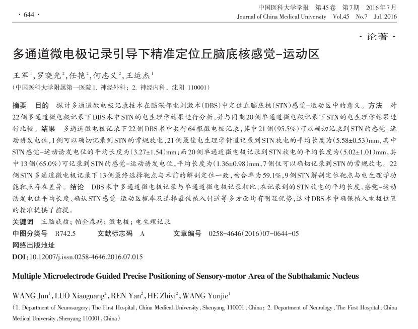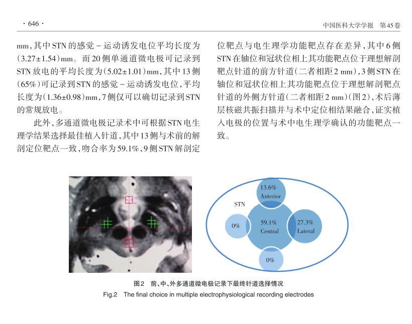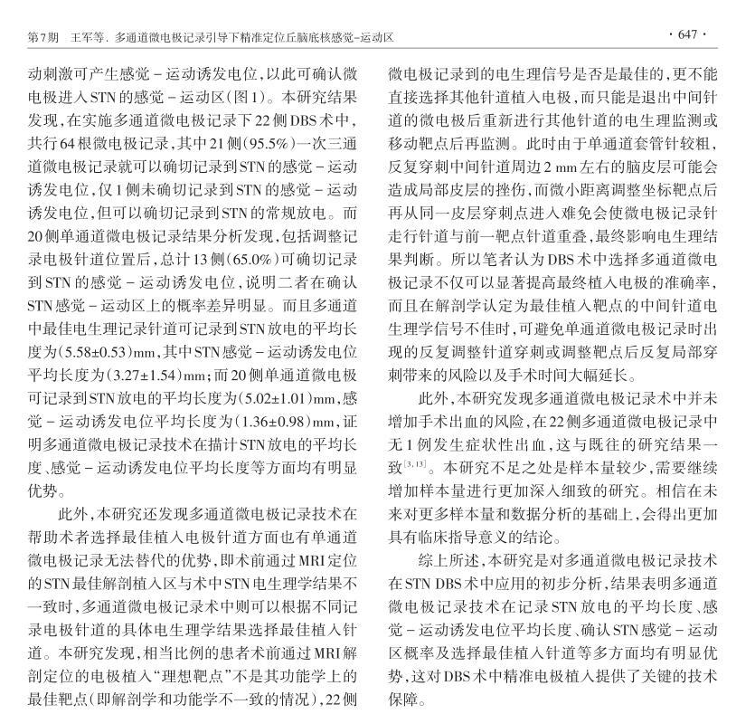 22側STN多通道微電極記錄下13側最終選擇靶點與術前的解剖定位一致,吻合率為59.1%,9側STN解剖定位靶點與電生理學功能靶點存在差異。結論DBS術中多通道微電極記錄與單通道微電極記錄相比,在記錄到的STN放電的平均長度、感覺-運動誘發電位平均長度、確認STN感覺-運動區概率及選擇最佳植入針道等多方面均有明顯優勢,這對DBS術中確保植入電極位置的精準提供了前提。