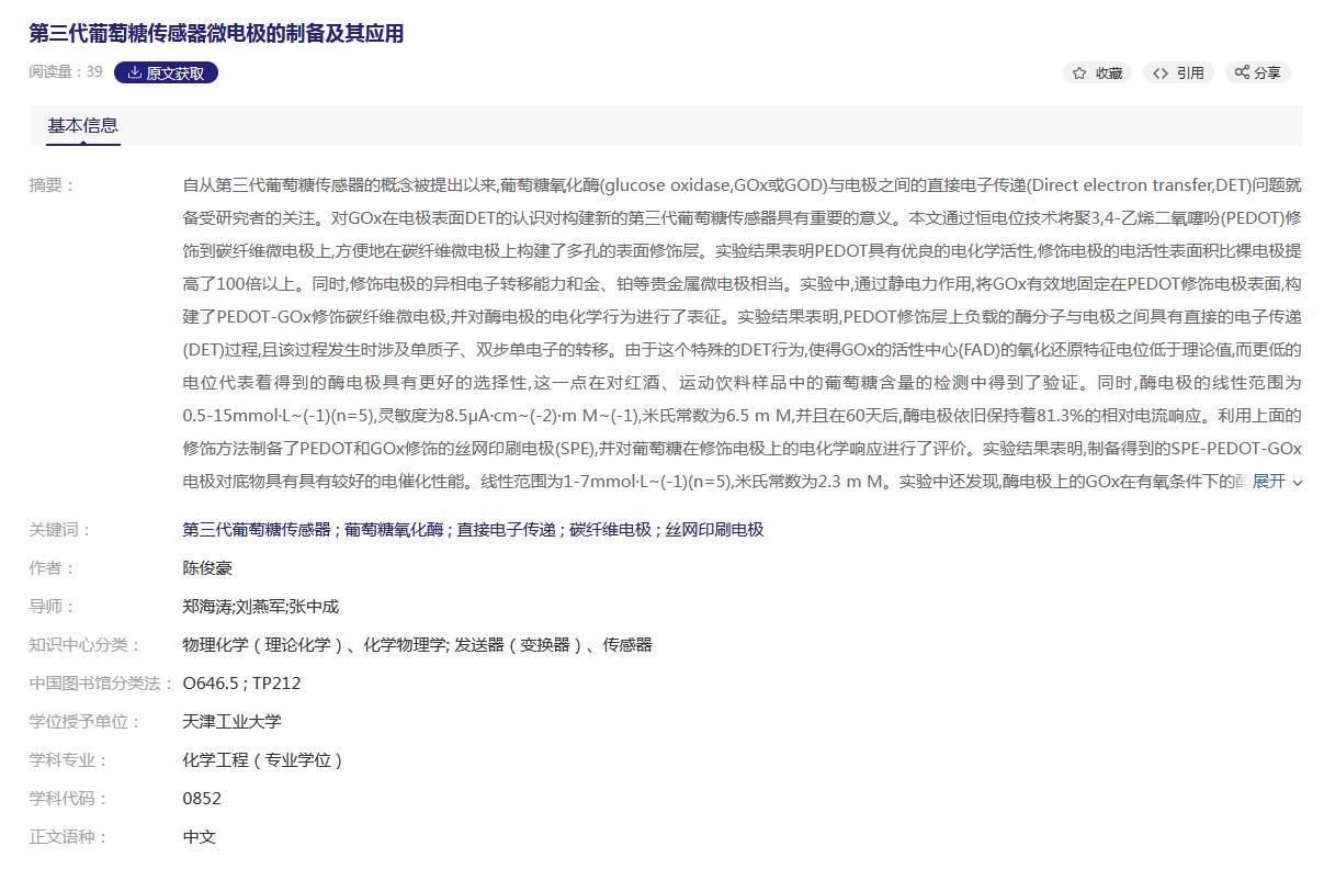 實驗結果表明,制備得到的SPE-PEDOT-GOx電極對底物具有具有較好的電催化性能。線性范圍為1-7mmol·L~(-1)(n=5),米氏常數為2.3 m M。實驗中還發現,酶電極上的GOx在有氧條件下的酶活性要大于無氧條件下的酶活,其中有氧條件下SPE-PEDOT-GOx電極上酶的最大催化反應速率是無氧條件下的10倍。在微尺度電極和常規尺度電極上的實驗結果,表明本文所使用的方法是一種具有一定實用性的實現葡萄糖氧化酶直接電化學的方法,這對于構建某些需要具有特殊尺寸及形狀的第三代葡萄糖傳感器具有較為重要的應用前景。