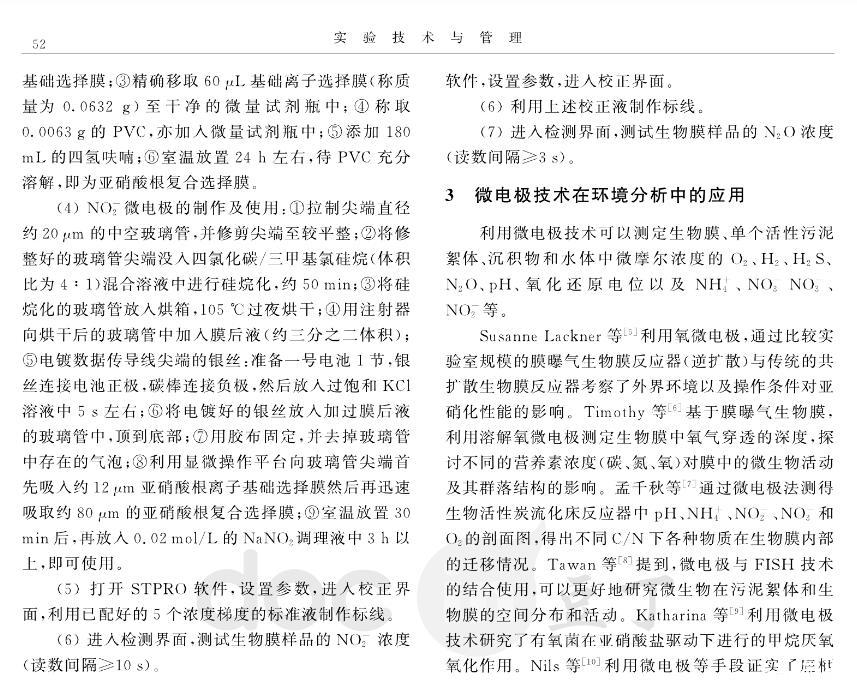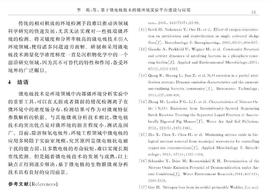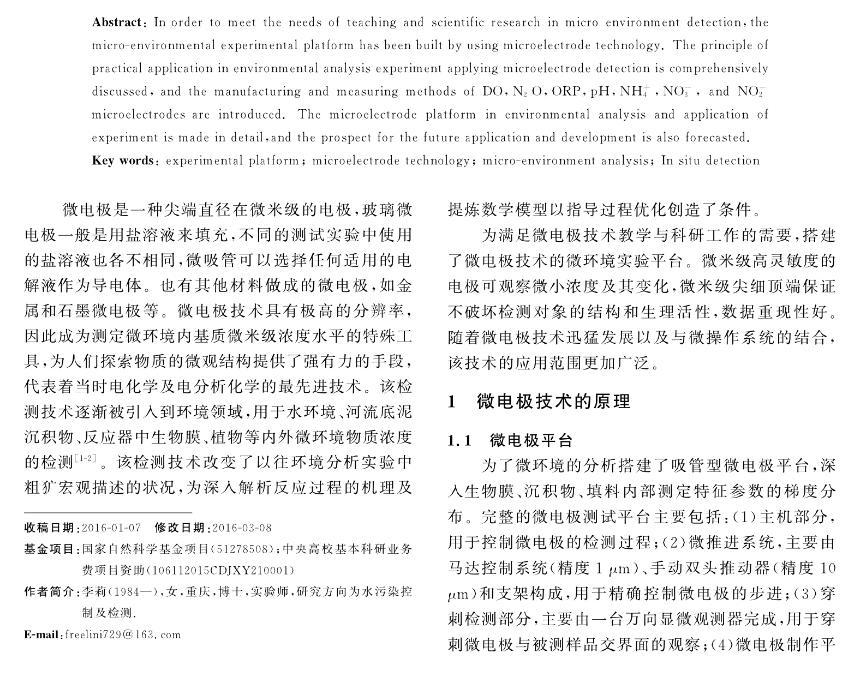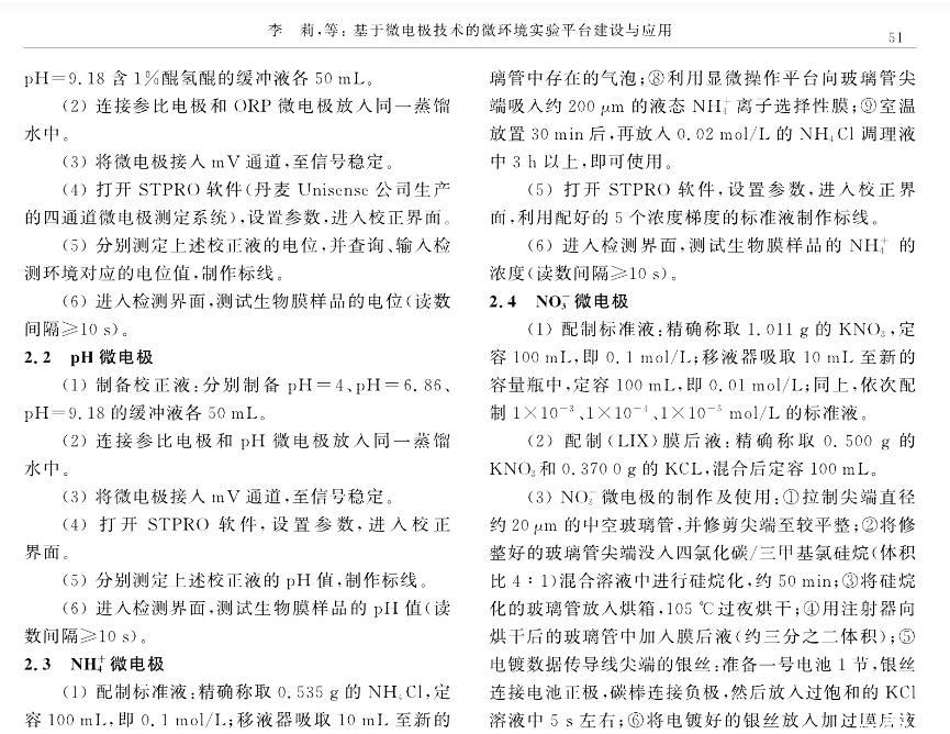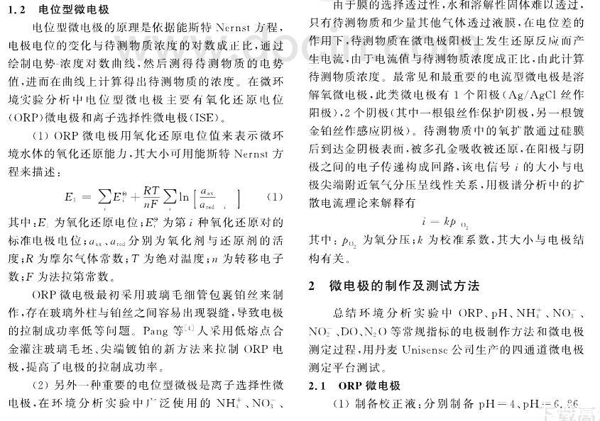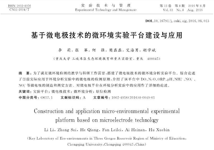 【摘要】:為了滿足微環(huán)境檢測的教學(xué)與科研工作需要,搭建了微電極技術(shù)的微環(huán)境分析實驗平臺。綜合論述了目前實際應(yīng)用于環(huán)境分析實驗中的微電極的檢測原理,介紹了該平臺中DO、N2O、ORP、pH、NH+4、NO-3、NO-2等微電極的制造和測定方法。對微電極平臺在環(huán)境分析實驗中的應(yīng)用作了詳細(xì)的論述。