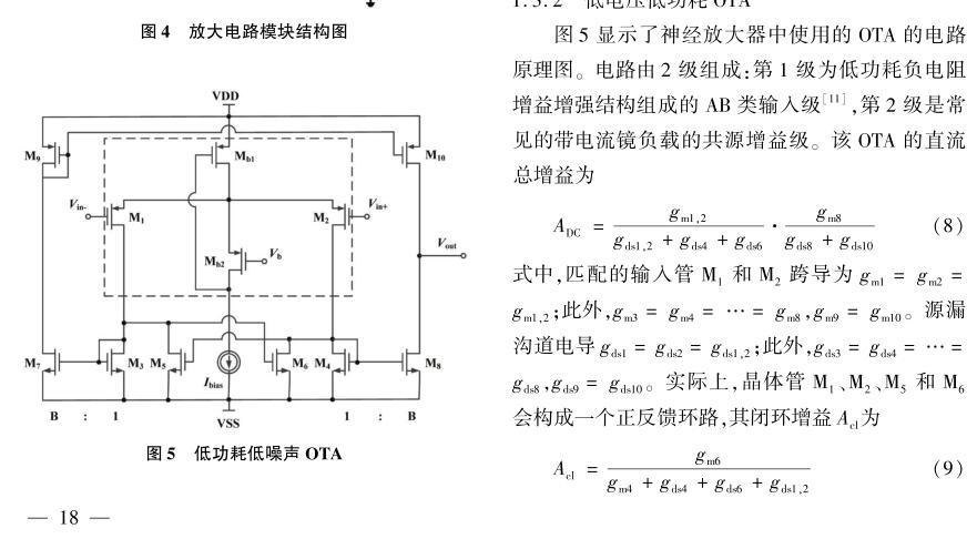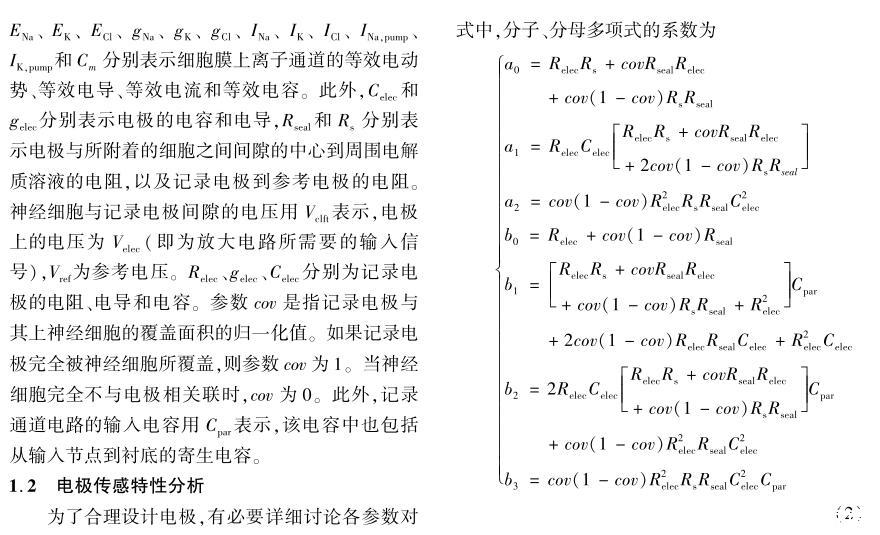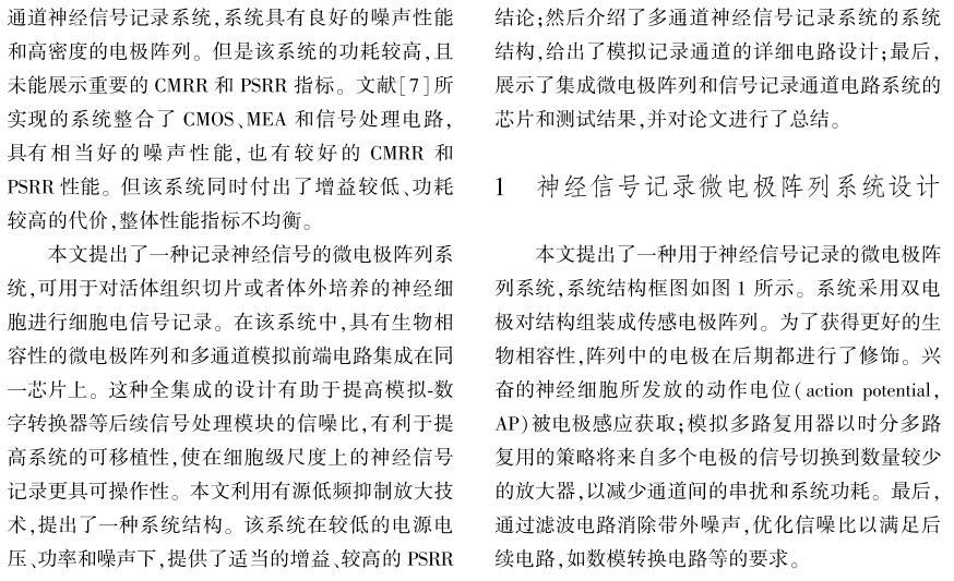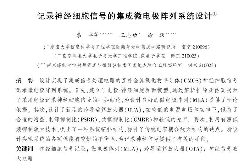 【摘要】:設計實現了集成信號處理電路的互補金屬氧化物半導體(CMOS)神經細胞信號記錄微電極陣列系統。首先,建立了電極-神經細胞界面模型,通過解析推導及仿真揭示了采用電極記錄神經細胞信號的一些結論,為設計良好的微電極陣列(MEA)提供了理論依據。其次,設計了新型的跨導運算放大器(OTA),在較低的電源電壓和功率下,保持了合適的增益、電源抑制比(PSRR)、共模抑制比(CMRR)和較低的噪聲。再次,利用有源低頻抑制放大技術,提出了一種系統拓撲結構,彌補了傳統電容耦合放大結構的缺點。所設計實現系統的各項性能有較好的平衡性,為記錄神經信號提供了有效的手段。