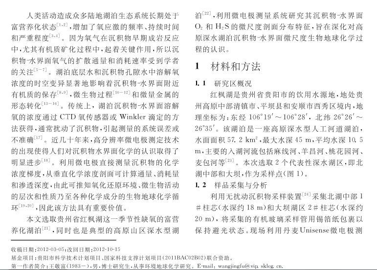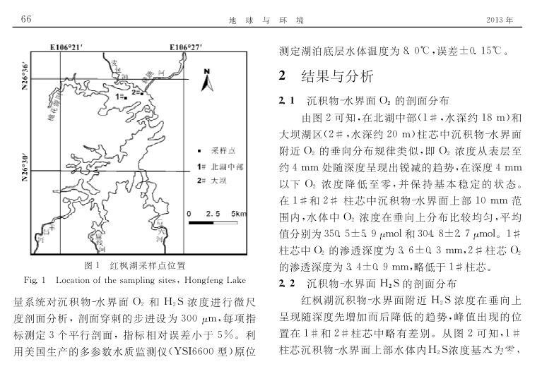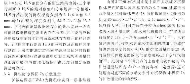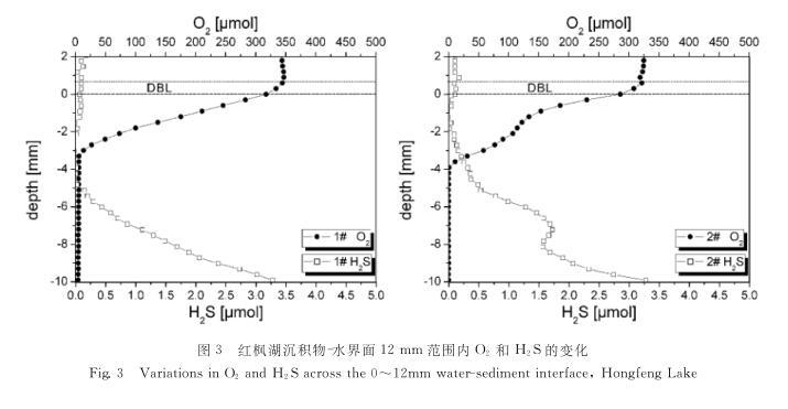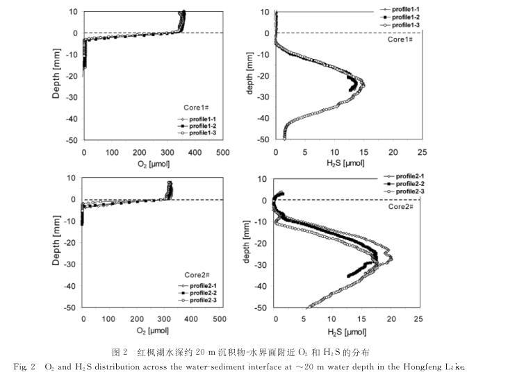 結(jié)果表明,紅楓湖北湖中部和大壩沉積物-水界面擴散邊界層厚度約為0.7mm,O2的擴散通量(J)分別為5.80和7.65mmol·m-2·d-1,O2的滲透深度分別為3.6±0.3mm和3.4±0.9mm,H2S的剖面變化主要受沉積物組成、O2消耗速率和硫酸鹽還原菌(SRB)分布的影響。